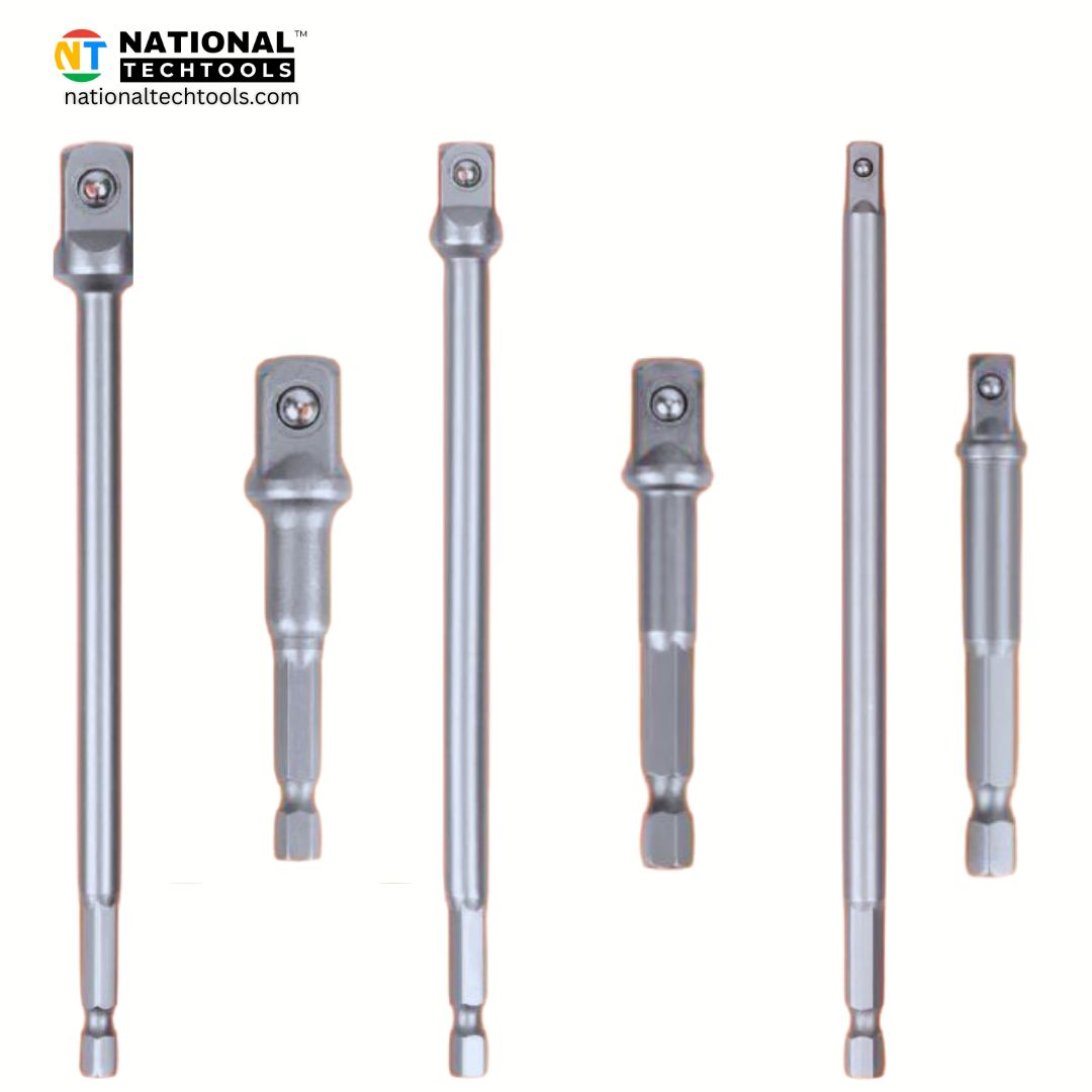 This is a 6 PCS Socket Adaptor set from the brand MAF PRO INDIA, designed to convert an impact driver or drill into a power socket wrench. The set is presented in a clear plastic clamshell package, allowing full visibility of the six metallic, heavy-duty adapters, which feature a dark, corrosion-resistant finish. Each adapter in the set is a specialized conversion tool with a 1/4-inch hexagonal shank on one end (for insertion into a drill chuck or impact driver) and a square drive on the other end (to accept sockets). The product label lists the specific sizes included, which combine both the square drive size and the shaft length: 1/2″x150 (1/2-inch drive, 150mm long), 3/8″x150, and 1/4″x150 for the three long extension adaptors; and 1/2″x72, 3/8″x65, and 1/4″x65 for the three shorter adaptors. This comprehensive six-piece kit allows users to quickly adapt various socket sizes (1/4″, 3/8″, and 1/2″ drive) to an electric power tool, greatly enhancing speed and convenience for tasks in automotive repair, construction, and general mechanical work.