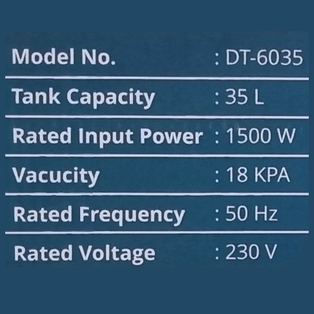 Operating on a 230V, 50Hz power supply, the DT-6035 offers consistent performance with a vacuum suction of 18 KPA, making it ideal for workshops, factories, warehouses, garages, and commercial spaces. Certified for quality and safety, this model is built to handle tough cleaning tasks with ease.