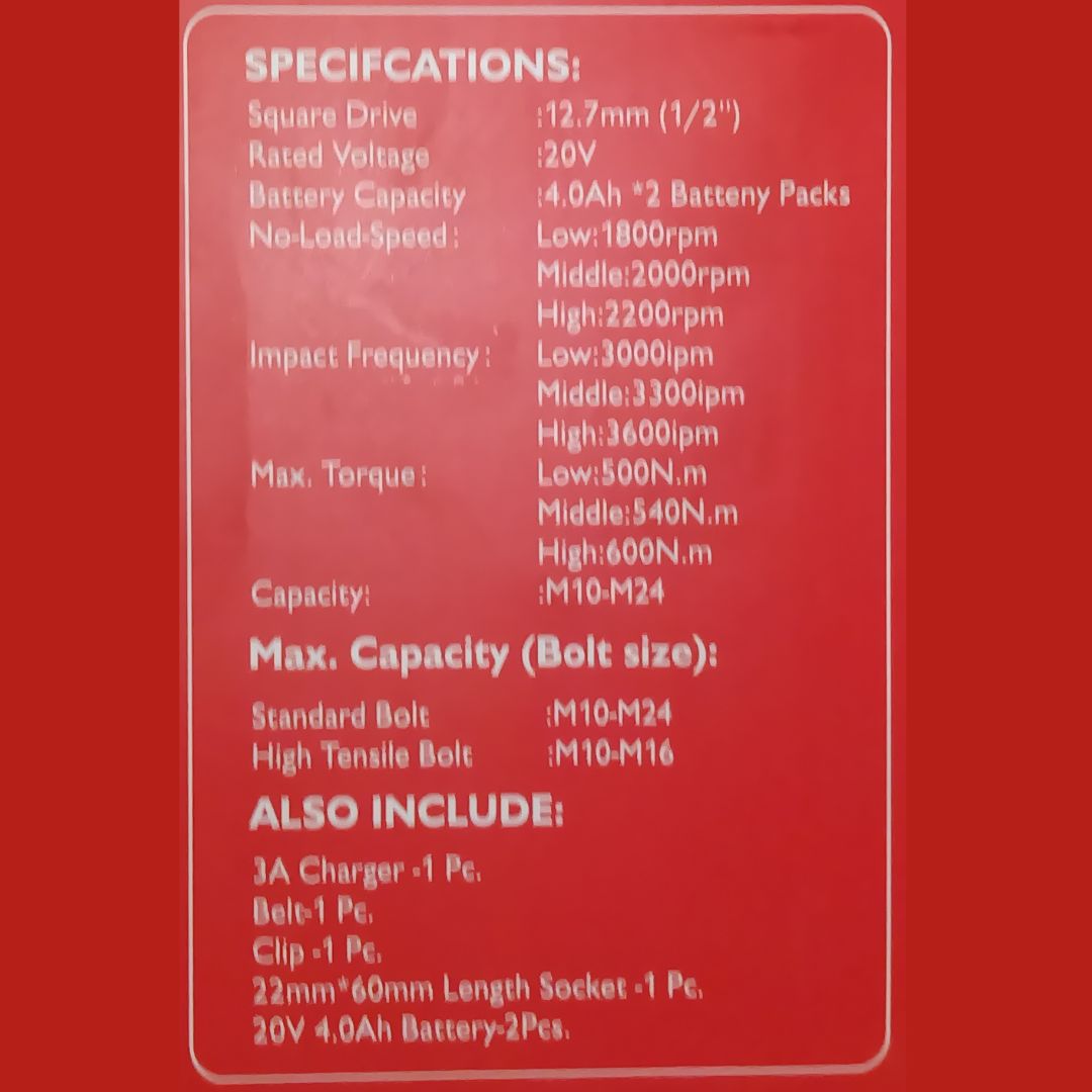 With a maximum torque output of 600 N·m and a 3-speed control system, users can easily adjust power levels to suit different fastening and loosening tasks. The 1/2 inch (12.7mm) square drive supports a wide range of sockets and is suitable for standard bolt sizes from M10 to M24 and high-tensile bolts from M10 to M16.