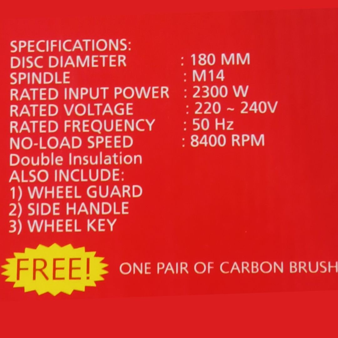 Equipped with a 180mm grinding disc and operating at a no-load speed of 8400 RPM, the tool ensures fast material removal and smooth operation. The helical gear system enhances efficiency while providing a longer working life. Its double insulation motor improves safety and reliability during continuous use.