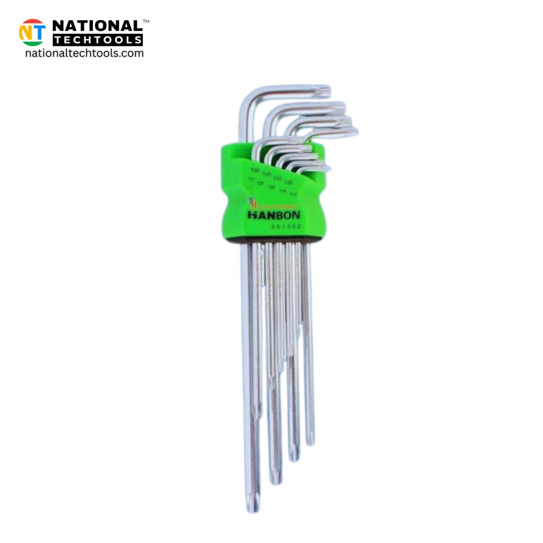 The HANBON 651302 Torx/Hex Key Set is a reliable and versatile tool kit designed for both professionals and DIY users. This 9-piece set features extra-long keys that provide greater reach and leverage, allowing you to work in tight or hard-to-access spaces with ease. Made from durable alloy steel, each key is heat-treated for strength and finished with a corrosion-resistant coating to ensure long-lasting performance. The ergonomic design makes tightening and loosening Torx and hex fasteners efficient and comfortable, reducing hand fatigue during extended use. Ideal for automotive repair, furniture assembly, machinery maintenance, and general household tasks, this set offers precision, durability, and convenience in one compact package.
