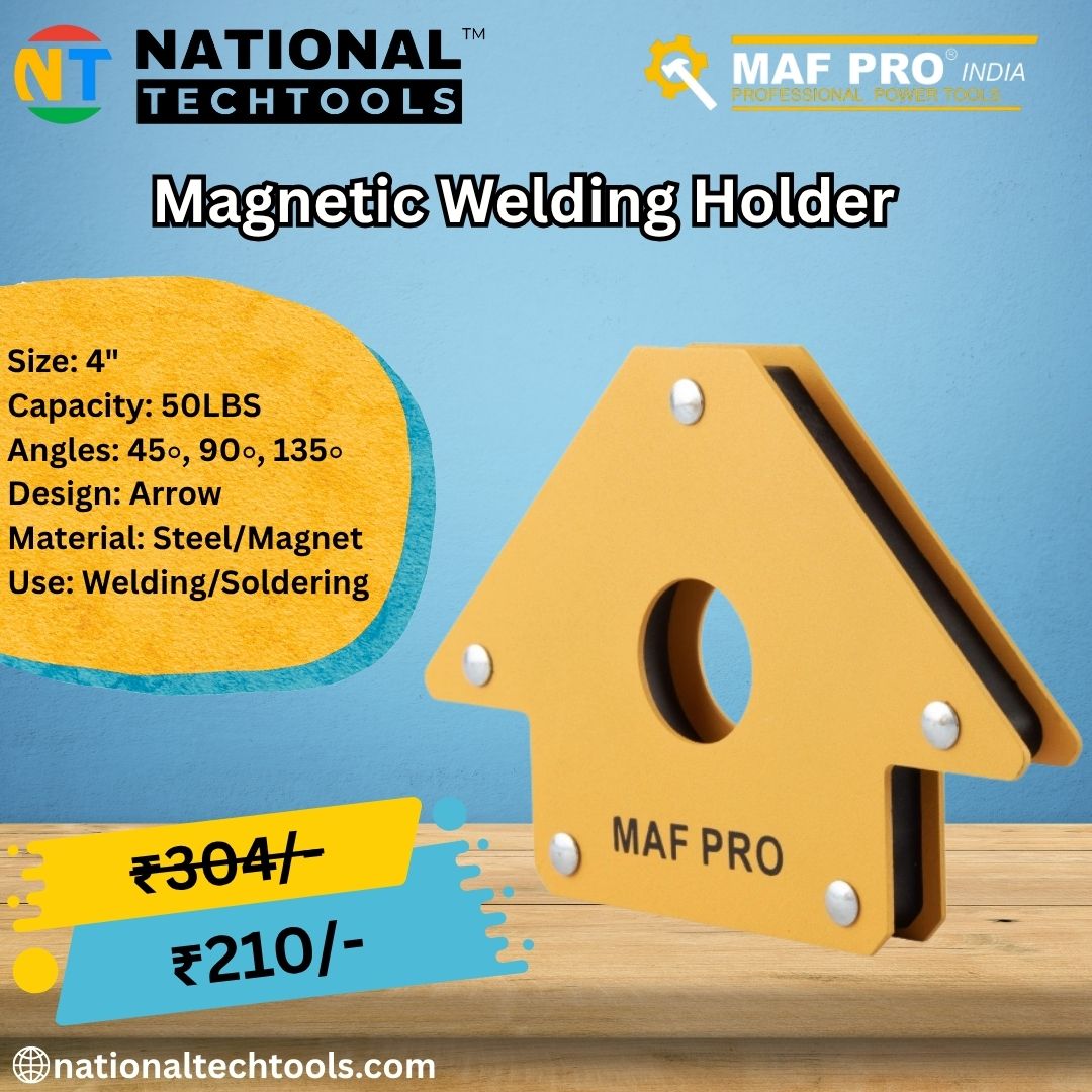 The MAF PRO INDIA MAGNETIC WELDING HOLDER (Model MMWH2400) is a heavy-duty, 4-inch, arrow-shaped magnetic clamp designed to provide a secure, hands-free solution for positioning ferrous metal workpieces during welding, soldering, and metal assembly. Utilizing a powerful permanent magnet, it boasts a 50 LBS (Pounds) holding capacity to firmly stabilize components. Its signature arrow design allows it to accurately hold materials at three critical angles: , , and , making it versatile for corners, flats, and pipe installations. The holder features a durable, often yellow-colored body encased in a strong steel frame, ensuring longevity and resistance to workshop conditions. This tool acts as an indispensable “third hand,” enhancing safety, improving precision, and speeding up the metal fabrication process for professionals and DIY enthusiasts alike.