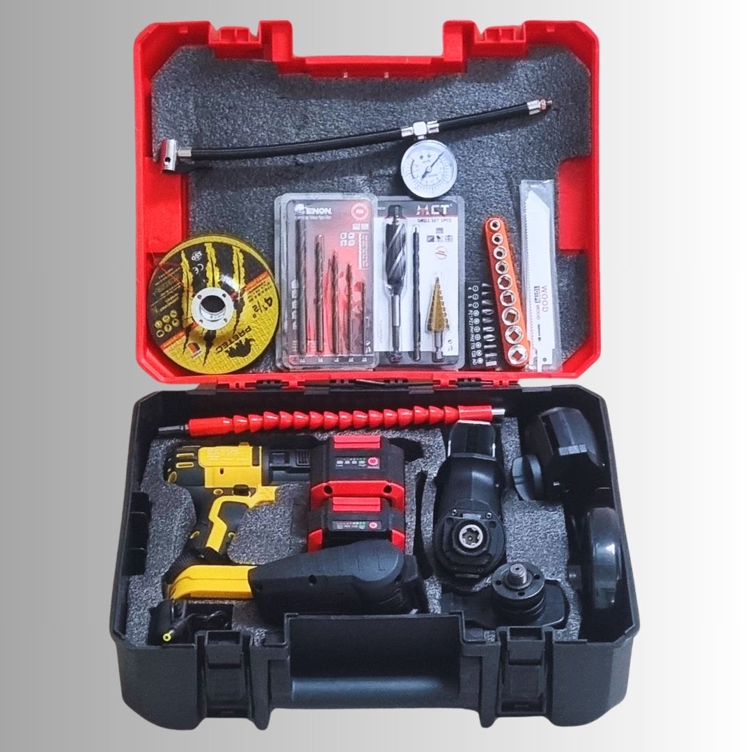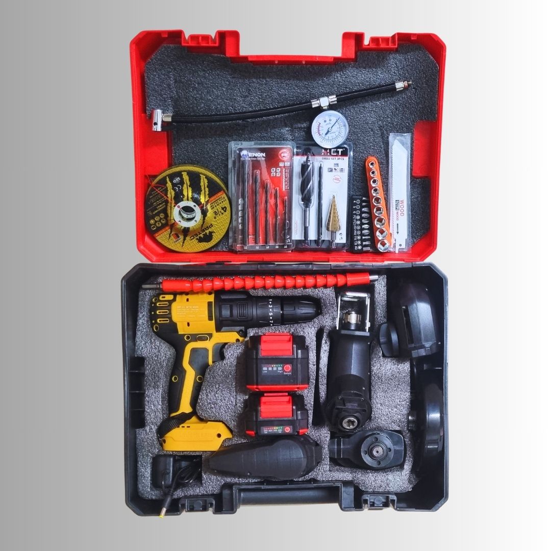 This combo kit includes multiple attachments such as drilling head, grinder, mini chainsaw, pruning shear, inflator pump, and accessories, enabling efficient multi-purpose operation from a single power unit. Ergonomic grip design ensures comfort and control during prolonged use.