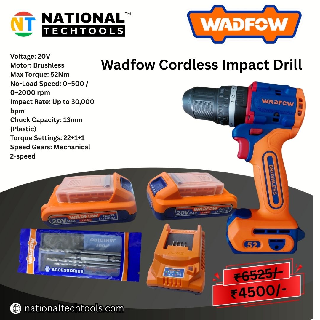 Wadfow 20V Cordless Impact Drill Brushless – 52Nm Torque, Dual Speed, 13mm Keyless Chuck