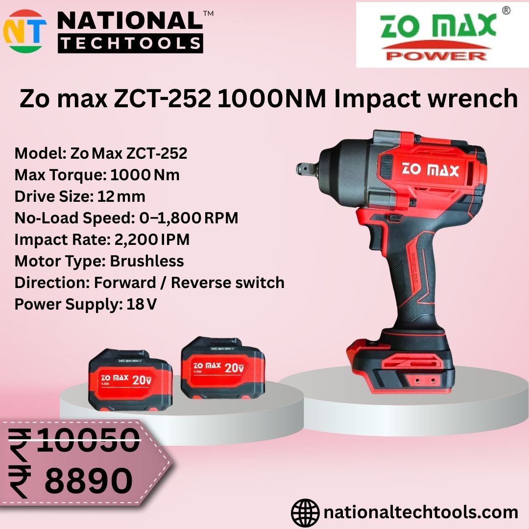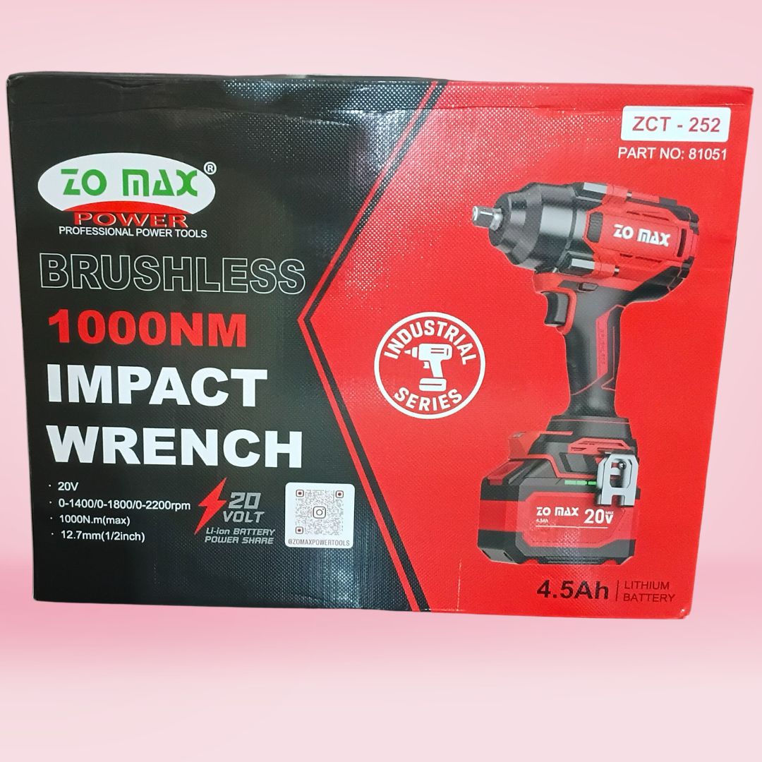 Tackle your toughest jobs with confidence using the Zo Max ZCT‑252 1000Nm Impact Wrench – a high-performance tool designed for both professional and heavy-duty DIY use. Engineered for maximum torque, durability, and convenience, this cordless impact wrench delivers up to 1000 Newton-meters (Nm) of fastening force, making it ideal for removing stubborn lug nuts, tightening heavy bolts, and working on cars, trucks, machinery, or construction equipment.